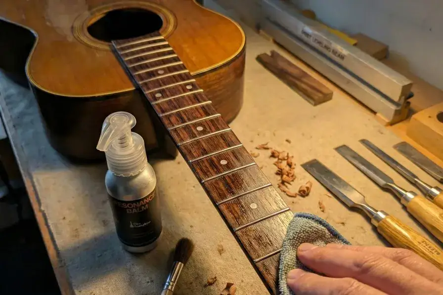 Resonance Balm is applied in sustained, multi-pass treatments to the fretboard and bridge. Severely dehydrated boards receive a 24-hour conditioning soak.